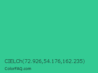 CIELCh 72.926,54.176,162.235 Color is a normal green color and the nearest color is Shamrock #33cc99. Hex code #33ca93 and RGB value is rgb(51,202,147). In RGB color space, this color is composed of 20% red, 79% green, 58% blue, In CMYK color space, this color is composed of 75% cyan, 0% magenta, 27% yellow , 21% black , In HSL color space, this color has a hue angle of 158° , 60% saturation and 50% lightness.