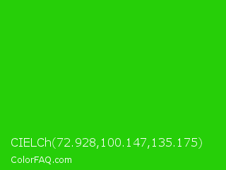 CIELCh 72.928,100.147,135.175 Color is a normal green color and the nearest color is Harlequin Green #46cb18. Hex code #26cf08 and RGB value is rgb(38,207,8). In RGB color space, this color is composed of 15% red, 81% green, 3% blue, In CMYK color space, this color is composed of 82% cyan, 0% magenta, 96% yellow , 19% black , In HSL color space, this color has a hue angle of 111° , 93% saturation and 42% lightness.