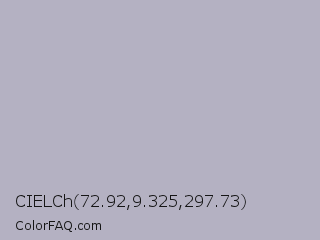 CIELCh 72.92,9.325,297.73 Color is a light indigo color and the nearest color is Chatelle #bdb3c7. Hex code #b4b1c2 and RGB value is rgb(180,177,194). In RGB color space, this color is composed of 71% red, 69% green, 76% blue, In CMYK color space, this color is composed of 7% cyan, 9% magenta, 0% yellow , 24% black , In HSL color space, this color has a hue angle of 251° , 12% saturation and 73% lightness.