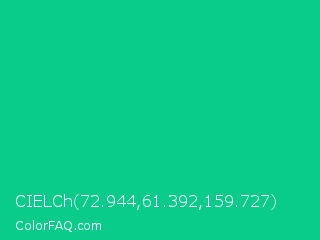 CIELCh 72.944,61.392,159.727 Color is a normal green color and the nearest color is Caribbean Green #00cc99. Hex code #09cc8a and RGB value is rgb(9,204,138). In RGB color space, this color is composed of 4% red, 80% green, 54% blue, In CMYK color space, this color is composed of 96% cyan, 0% magenta, 32% yellow , 20% black , In HSL color space, this color has a hue angle of 160° , 92% saturation and 42% lightness.