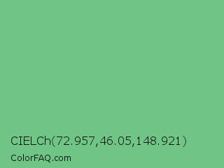 CIELCh 72.957,46.05,148.921 Color is a light green color and the nearest color is De York #7ac488. Hex code #70c586 and RGB value is rgb(112,197,134). In RGB color space, this color is composed of 44% red, 77% green, 53% blue, In CMYK color space, this color is composed of 43% cyan, 0% magenta, 32% yellow , 23% black , In HSL color space, this color has a hue angle of 136° , 42% saturation and 61% lightness.