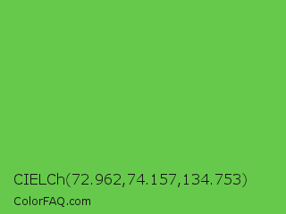 CIELCh 72.962,74.157,134.753 Color is a normal green color and the nearest color is Mantis #74c365. Hex code #66c94b and RGB value is rgb(102,201,75). In RGB color space, this color is composed of 40% red, 79% green, 29% blue, In CMYK color space, this color is composed of 49% cyan, 0% magenta, 63% yellow , 21% black , In HSL color space, this color has a hue angle of 107° , 54% saturation and 54% lightness.