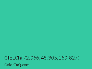 CIELCh 72.966,48.305,169.827 Color is a normal cyan color and the nearest color is Shamrock #33cc99. Hex code #34c9a2 and RGB value is rgb(52,201,162). In RGB color space, this color is composed of 20% red, 79% green, 64% blue, In CMYK color space, this color is composed of 74% cyan, 0% magenta, 19% yellow , 21% black , In HSL color space, this color has a hue angle of 164° , 59% saturation and 50% lightness.