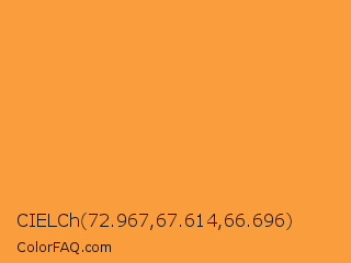 CIELCh 72.967,67.614,66.696 Color is a light orange color and the nearest color is Neon Carrot #ffa343. Hex code #fa9e3d and RGB value is rgb(250,158,61). In RGB color space, this color is composed of 98% red, 62% green, 24% blue, In CMYK color space, this color is composed of 0% cyan, 37% magenta, 76% yellow , 2% black , In HSL color space, this color has a hue angle of 31° , 95% saturation and 61% lightness.