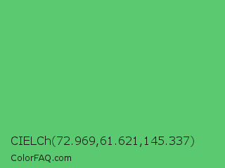 CIELCh 72.969,61.621,145.337 Color is a normal green color and the nearest color is Emerald #50c878. Hex code #5ac970 and RGB value is rgb(90,201,112). In RGB color space, this color is composed of 35% red, 79% green, 44% blue, In CMYK color space, this color is composed of 55% cyan, 0% magenta, 44% yellow , 21% black , In HSL color space, this color has a hue angle of 132° , 51% saturation and 57% lightness.