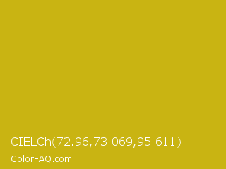 CIELCh 72.96,73.069,95.611 Color is a normal yellow color and the nearest color is Galliano #dcb20c. Hex code #c9b412 and RGB value is rgb(201,180,18). In RGB color space, this color is composed of 79% red, 71% green, 7% blue, In CMYK color space, this color is composed of 0% cyan, 10% magenta, 91% yellow , 21% black , In HSL color space, this color has a hue angle of 53° , 84% saturation and 43% lightness.
