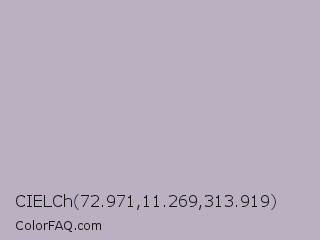 CIELCh 72.971,11.269,313.919 Color is a light purple color and the nearest color is Chatelle #bdb3c7. Hex code #bbafc2 and RGB value is rgb(187,175,194). In RGB color space, this color is composed of 73% red, 69% green, 76% blue, In CMYK color space, this color is composed of 4% cyan, 10% magenta, 0% yellow , 24% black , In HSL color space, this color has a hue angle of 278° , 13% saturation and 72% lightness.