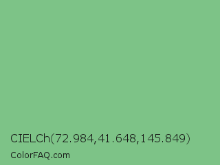 CIELCh 72.984,41.648,145.849 Color is a light green color and the nearest color is De York #7ac488. Hex code #7dc387 and RGB value is rgb(125,195,135). In RGB color space, this color is composed of 49% red, 76% green, 53% blue, In CMYK color space, this color is composed of 36% cyan, 0% magenta, 31% yellow , 24% black , In HSL color space, this color has a hue angle of 129° , 37% saturation and 63% lightness.