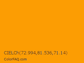 CIELCh 72.994,81.536,71.14 Color is a normal orange color and the nearest color is California #fe9d04. Hex code #fc9e03 and RGB value is rgb(252,158,3). In RGB color space, this color is composed of 99% red, 62% green, 1% blue, In CMYK color space, this color is composed of 0% cyan, 37% magenta, 99% yellow , 1% black , In HSL color space, this color has a hue angle of 37° , 98% saturation and 50% lightness.