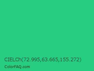 CIELCh 72.995,63.665,155.272 Color is a normal green color and the nearest color is Mountain Meadow #30ba8f. Hex code #26cc80 and RGB value is rgb(38,204,128). In RGB color space, this color is composed of 15% red, 80% green, 50% blue, In CMYK color space, this color is composed of 81% cyan, 0% magenta, 37% yellow , 20% black , In HSL color space, this color has a hue angle of 153° , 69% saturation and 47% lightness.