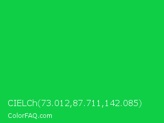 CIELCh 73.012,87.711,142.085 Color is a normal green color and the nearest color is Malachite #0bda51. Hex code #0fcf47 and RGB value is rgb(15,207,71). In RGB color space, this color is composed of 6% red, 81% green, 28% blue, In CMYK color space, this color is composed of 93% cyan, 0% magenta, 66% yellow , 19% black , In HSL color space, this color has a hue angle of 138° , 86% saturation and 44% lightness.