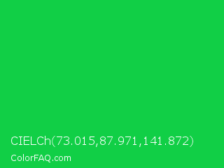 CIELCh 73.015,87.971,141.872 Color is a normal green color and the nearest color is Malachite #0bda51. Hex code #11cf46 and RGB value is rgb(17,207,70). In RGB color space, this color is composed of 7% red, 81% green, 27% blue, In CMYK color space, this color is composed of 92% cyan, 0% magenta, 66% yellow , 19% black , In HSL color space, this color has a hue angle of 137° , 85% saturation and 44% lightness.