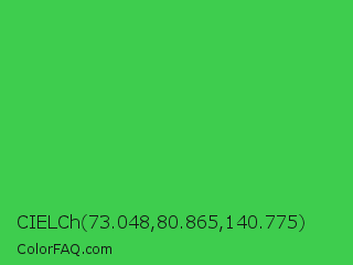 CIELCh 73.048,80.865,140.775 Color is a normal green color and the nearest color is Lime Green #32cd32. Hex code #3ecd4e and RGB value is rgb(62,205,78). In RGB color space, this color is composed of 24% red, 80% green, 31% blue, In CMYK color space, this color is composed of 70% cyan, 0% magenta, 62% yellow , 20% black , In HSL color space, this color has a hue angle of 127° , 59% saturation and 52% lightness.