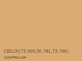 CIELCh 73.069,36.781,73.796 Color is a light orange color and the nearest color is Fawn #e5aa70. Hex code #daab73 and RGB value is rgb(218,171,115). In RGB color space, this color is composed of 85% red, 67% green, 45% blue, In CMYK color space, this color is composed of 0% cyan, 22% magenta, 47% yellow , 15% black , In HSL color space, this color has a hue angle of 33° , 58% saturation and 65% lightness.