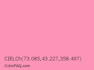 CIELCh 73.085,43.227,358.497 Color is a light rose color and the nearest color is Schauss Pink #ff91af. Hex code #fc94b7 and RGB value is rgb(252,148,183). In RGB color space, this color is composed of 99% red, 58% green, 72% blue, In CMYK color space, this color is composed of 0% cyan, 41% magenta, 27% yellow , 1% black , In HSL color space, this color has a hue angle of 340° , 95% saturation and 78% lightness.