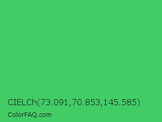 CIELCh 73.091,70.853,145.585 Color is a normal green color and the nearest color is UFO Green #3cd070. Hex code #42cc66 and RGB value is rgb(66,204,102). In RGB color space, this color is composed of 26% red, 80% green, 40% blue, In CMYK color space, this color is composed of 68% cyan, 0% magenta, 50% yellow , 20% black , In HSL color space, this color has a hue angle of 136° , 58% saturation and 53% lightness.
