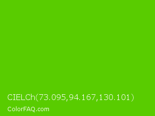 CIELCh 73.095,94.167,130.101 Color is a normal green color and the nearest color is Harlequin Green #46cb18. Hex code #59cc00 and RGB value is rgb(89,204,0). In RGB color space, this color is composed of 35% red, 80% green, 0% blue, In CMYK color space, this color is composed of 56% cyan, 0% magenta, 100% yellow , 20% black , In HSL color space, this color has a hue angle of 94° , 100% saturation and 40% lightness.