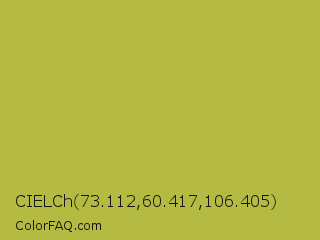 CIELCh 73.112,60.417,106.405 Color is a normal yellow color and the nearest color is Brass #b5a642. Hex code #b5ba42 and RGB value is rgb(181,186,66). In RGB color space, this color is composed of 71% red, 73% green, 26% blue, In CMYK color space, this color is composed of 3% cyan, 0% magenta, 65% yellow , 27% black , In HSL color space, this color has a hue angle of 63° , 48% saturation and 49% lightness.