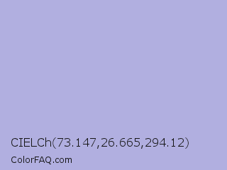 CIELCh 73.147,26.665,294.12 Color is a light indigo color and the nearest color is Maximum Blue Purple #acace6. Hex code #b1afe0 and RGB value is rgb(177,175,224). In RGB color space, this color is composed of 69% red, 69% green, 88% blue, In CMYK color space, this color is composed of 21% cyan, 22% magenta, 0% yellow , 12% black , In HSL color space, this color has a hue angle of 242° , 44% saturation and 78% lightness.
