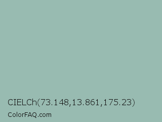 CIELCh 73.148,13.861,175.23 Color is a light green color and the nearest color is Summer Green #96bbab. Hex code #98bbb1 and RGB value is rgb(152,187,177). In RGB color space, this color is composed of 60% red, 73% green, 69% blue, In CMYK color space, this color is composed of 19% cyan, 0% magenta, 5% yellow , 27% black , In HSL color space, this color has a hue angle of 163° , 20% saturation and 66% lightness.