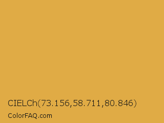 CIELCh 73.156,58.711,80.846 Color is a normal orange color and the nearest color is Anzac #e0b646. Hex code #e0ab45 and RGB value is rgb(224,171,69). In RGB color space, this color is composed of 88% red, 67% green, 27% blue, In CMYK color space, this color is composed of 0% cyan, 24% magenta, 69% yellow , 12% black , In HSL color space, this color has a hue angle of 39° , 71% saturation and 57% lightness.