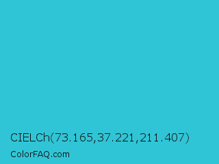 CIELCh 73.165,37.221,211.407 Color is a normal cyan color and the nearest color is Scooter #2ebfd4. Hex code #30c5d6 and RGB value is rgb(48,197,214). In RGB color space, this color is composed of 19% red, 77% green, 84% blue, In CMYK color space, this color is composed of 78% cyan, 8% magenta, 0% yellow , 16% black , In HSL color space, this color has a hue angle of 186° , 67% saturation and 51% lightness.