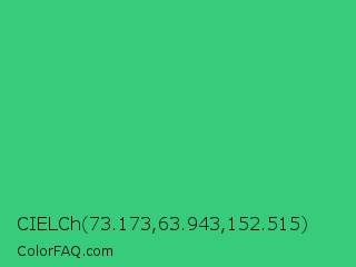 CIELCh 73.173,63.943,152.515 Color is a normal green color and the nearest color is UFO Green #3cd070. Hex code #37cc7b and RGB value is rgb(55,204,123). In RGB color space, this color is composed of 22% red, 80% green, 48% blue, In CMYK color space, this color is composed of 73% cyan, 0% magenta, 40% yellow , 20% black , In HSL color space, this color has a hue angle of 147° , 59% saturation and 51% lightness.