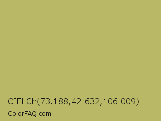 CIELCh 73.188,42.632,106.009 Color is a normal yellow color and the nearest color is Gimblet #b8b56a. Hex code #b8b867 and RGB value is rgb(184,184,103). In RGB color space, this color is composed of 72% red, 72% green, 40% blue, In CMYK color space, this color is composed of 0% cyan, 0% magenta, 44% yellow , 28% black , In HSL color space, this color has a hue angle of 60° , 36% saturation and 56% lightness.