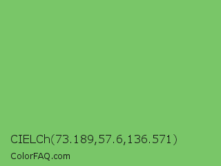CIELCh 73.189,57.6,136.571 Color is a normal green color and the nearest color is Mantis #74c365. Hex code #79c668 and RGB value is rgb(121,198,104). In RGB color space, this color is composed of 47% red, 78% green, 41% blue, In CMYK color space, this color is composed of 39% cyan, 0% magenta, 47% yellow , 22% black , In HSL color space, this color has a hue angle of 109° , 45% saturation and 59% lightness.