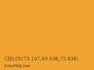 CIELCh 73.197,69.638,73.838 Color is a normal orange color and the nearest color is Fuel Yellow #eca927. Hex code #f1a430 and RGB value is rgb(241,164,48). In RGB color space, this color is composed of 95% red, 64% green, 19% blue, In CMYK color space, this color is composed of 0% cyan, 32% magenta, 80% yellow , 5% black , In HSL color space, this color has a hue angle of 36° , 87% saturation and 57% lightness.