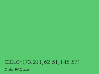 CIELCh 73.211,62.51,145.57 Color is a normal green color and the nearest color is Emerald #50c878. Hex code #58ca70 and RGB value is rgb(88,202,112). In RGB color space, this color is composed of 35% red, 79% green, 44% blue, In CMYK color space, this color is composed of 56% cyan, 0% magenta, 45% yellow , 21% black , In HSL color space, this color has a hue angle of 133° , 52% saturation and 57% lightness.