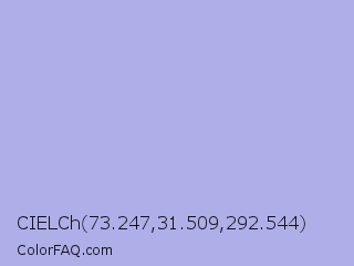 CIELCh 73.247,31.509,292.544 Color is a light blue color and the nearest color is Maximum Blue Purple #acace6. Hex code #aeafe9 and RGB value is rgb(174,175,233). In RGB color space, this color is composed of 68% red, 69% green, 91% blue, In CMYK color space, this color is composed of 25% cyan, 25% magenta, 0% yellow , 9% black , In HSL color space, this color has a hue angle of 239° , 57% saturation and 80% lightness.