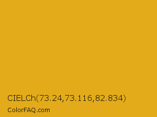 CIELCh 73.24,73.116,82.834 Color is a normal orange color and the nearest color is Urobilin #e1ad21. Hex code #e3ab1a and RGB value is rgb(227,171,26). In RGB color space, this color is composed of 89% red, 67% green, 10% blue, In CMYK color space, this color is composed of 0% cyan, 25% magenta, 89% yellow , 11% black , In HSL color space, this color has a hue angle of 43° , 79% saturation and 50% lightness.