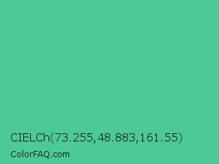 CIELCh 73.255,48.883,161.55 Color is a normal green color and the nearest color is Ocean Green #48bf91. Hex code #4dc996 and RGB value is rgb(77,201,150). In RGB color space, this color is composed of 30% red, 79% green, 59% blue, In CMYK color space, this color is composed of 62% cyan, 0% magenta, 25% yellow , 21% black , In HSL color space, this color has a hue angle of 155° , 53% saturation and 55% lightness.