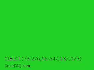 CIELCh 73.276,96.647,137.075 Color is a normal green color and the nearest color is Lime Green #32cd32. Hex code #22d025 and RGB value is rgb(34,208,37). In RGB color space, this color is composed of 13% red, 82% green, 15% blue, In CMYK color space, this color is composed of 84% cyan, 0% magenta, 82% yellow , 18% black , In HSL color space, this color has a hue angle of 121° , 72% saturation and 47% lightness.