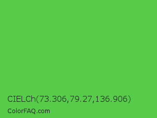 CIELCh 73.306,79.27,136.906 Color is a normal green color and the nearest color is Apple #4fa83d. Hex code #56cc48 and RGB value is rgb(86,204,72). In RGB color space, this color is composed of 34% red, 80% green, 28% blue, In CMYK color space, this color is composed of 58% cyan, 0% magenta, 65% yellow , 20% black , In HSL color space, this color has a hue angle of 114° , 56% saturation and 54% lightness.