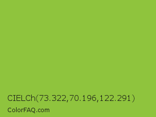 CIELCh 73.322,70.196,122.291 Color is a normal green color and the nearest color is Yellow Green #9acd32. Hex code #8fc43d and RGB value is rgb(143,196,61). In RGB color space, this color is composed of 56% red, 77% green, 24% blue, In CMYK color space, this color is composed of 27% cyan, 0% magenta, 69% yellow , 23% black , In HSL color space, this color has a hue angle of 84° , 53% saturation and 50% lightness.