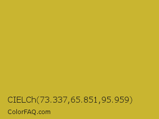 CIELCh 73.337,65.851,95.959 Color is a normal yellow color and the nearest color is Earls Green #c9b93b. Hex code #c9b530 and RGB value is rgb(201,181,48). In RGB color space, this color is composed of 79% red, 71% green, 19% blue, In CMYK color space, this color is composed of 0% cyan, 10% magenta, 76% yellow , 21% black , In HSL color space, this color has a hue angle of 52° , 61% saturation and 49% lightness.