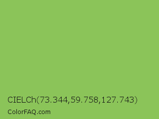 CIELCh 73.344,59.758,127.743 Color is a normal green color and the nearest color is Dollar Bill #85bb65. Hex code #8bc459 and RGB value is rgb(139,196,89). In RGB color space, this color is composed of 55% red, 77% green, 35% blue, In CMYK color space, this color is composed of 29% cyan, 0% magenta, 55% yellow , 23% black , In HSL color space, this color has a hue angle of 92° , 48% saturation and 56% lightness.