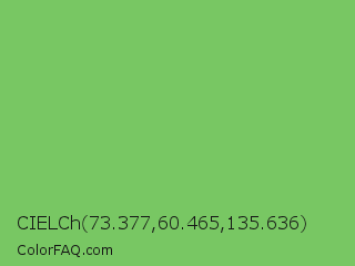 CIELCh 73.377,60.465,135.636 Color is a normal green color and the nearest color is Mantis #74c365. Hex code #78c763 and RGB value is rgb(120,199,99). In RGB color space, this color is composed of 47% red, 78% green, 39% blue, In CMYK color space, this color is composed of 40% cyan, 0% magenta, 50% yellow , 22% black , In HSL color space, this color has a hue angle of 107° , 47% saturation and 58% lightness.