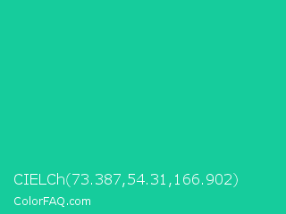CIELCh 73.387,54.31,166.902 Color is a normal cyan color and the nearest color is Caribbean Green #00cc99. Hex code #16cc9c and RGB value is rgb(22,204,156). In RGB color space, this color is composed of 9% red, 80% green, 61% blue, In CMYK color space, this color is composed of 89% cyan, 0% magenta, 24% yellow , 20% black , In HSL color space, this color has a hue angle of 164° , 81% saturation and 44% lightness.