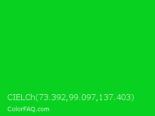 CIELCh 73.392,99.097,137.403 Color is a normal green color and the nearest color is Vivid Malachite #00cc33. Hex code #09d120 and RGB value is rgb(9,209,32). In RGB color space, this color is composed of 4% red, 82% green, 13% blue, In CMYK color space, this color is composed of 96% cyan, 0% magenta, 85% yellow , 18% black , In HSL color space, this color has a hue angle of 127° , 92% saturation and 43% lightness.