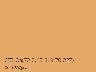 CIELCh 73.3,45.219,70.327 Color is a light orange color and the nearest color is Earth Yellow #e1a95f. Hex code #e5a866 and RGB value is rgb(229,168,102). In RGB color space, this color is composed of 90% red, 66% green, 40% blue, In CMYK color space, this color is composed of 0% cyan, 27% magenta, 55% yellow , 10% black , In HSL color space, this color has a hue angle of 31° , 71% saturation and 65% lightness.