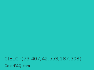 CIELCh 73.407,42.553,187.398 Color is a normal cyan color and the nearest color is Java #1fc2c2. Hex code #22c9bd and RGB value is rgb(34,201,189). In RGB color space, this color is composed of 13% red, 79% green, 74% blue, In CMYK color space, this color is composed of 83% cyan, 0% magenta, 6% yellow , 21% black , In HSL color space, this color has a hue angle of 176° , 71% saturation and 46% lightness.
