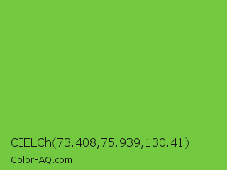 CIELCh 73.408,75.939,130.41 Color is a normal green color and the nearest color is Green RYB #66b032. Hex code #73c940 and RGB value is rgb(115,201,64). In RGB color space, this color is composed of 45% red, 79% green, 25% blue, In CMYK color space, this color is composed of 43% cyan, 0% magenta, 68% yellow , 21% black , In HSL color space, this color has a hue angle of 98° , 56% saturation and 52% lightness.
