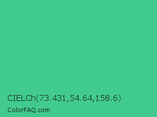CIELCh 73.431,54.64,158.6 Color is a normal green color and the nearest color is Ocean Green #48bf91. Hex code #42cb8e and RGB value is rgb(66,203,142). In RGB color space, this color is composed of 26% red, 80% green, 56% blue, In CMYK color space, this color is composed of 67% cyan, 0% magenta, 30% yellow , 20% black , In HSL color space, this color has a hue angle of 153° , 57% saturation and 53% lightness.