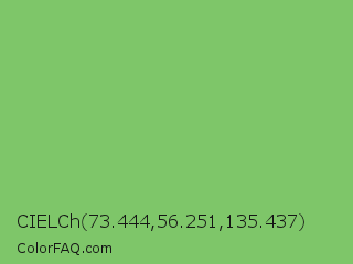 CIELCh 73.444,56.251,135.437 Color is a normal green color and the nearest color is Mantis #74c365. Hex code #7ec669 and RGB value is rgb(126,198,105). In RGB color space, this color is composed of 49% red, 78% green, 41% blue, In CMYK color space, this color is composed of 36% cyan, 0% magenta, 47% yellow , 22% black , In HSL color space, this color has a hue angle of 106° , 45% saturation and 59% lightness.
