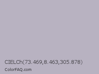 CIELCh 73.469,8.463,305.878 Color is a light violet color and the nearest color is Chatelle #bdb3c7. Hex code #b8b2c1 and RGB value is rgb(184,178,193). In RGB color space, this color is composed of 72% red, 70% green, 76% blue, In CMYK color space, this color is composed of 5% cyan, 8% magenta, 0% yellow , 24% black , In HSL color space, this color has a hue angle of 264° , 11% saturation and 73% lightness.