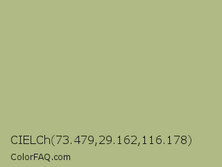 CIELCh 73.479,29.162,116.178 Color is a light lime color and the nearest color is Swamp Green #acb78e. Hex code #afba84 and RGB value is rgb(175,186,132). In RGB color space, this color is composed of 69% red, 73% green, 52% blue, In CMYK color space, this color is composed of 6% cyan, 0% magenta, 29% yellow , 27% black , In HSL color space, this color has a hue angle of 72° , 28% saturation and 62% lightness.