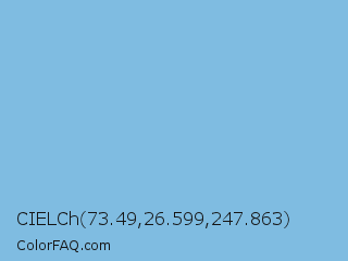 CIELCh 73.49,26.599,247.863 Color is a light blue color and the nearest color is Aero #7cb9e8. Hex code #7fbce1 and RGB value is rgb(127,188,225). In RGB color space, this color is composed of 50% red, 74% green, 88% blue, In CMYK color space, this color is composed of 44% cyan, 16% magenta, 0% yellow , 12% black , In HSL color space, this color has a hue angle of 203° , 62% saturation and 69% lightness.